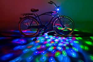 Red, blue, and green LEDs shine through a lens to project ground effect patterns that illuminate any bicycle. The patterns blink through various color combinations automatically. The included quick-clamp makes