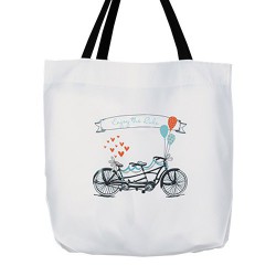 White tote with vintage tandem bike design. Enjoy the ride! Sweet pattern for a romantic occasion. Measures 17 x 16-Inch with black handles. Product Features White tote bag printed
