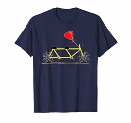 Cute tandem bike shirt for couples to wear. Yellow bike with red heart balloon for boyfriends and girlfriends to ride. Wear this shirt as you ride tandem bikes in