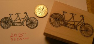 Miniature tandem bicycle rubber stamp. Wood mounted and deep etched. it is sooooo cute!! Measures 1×0.4″