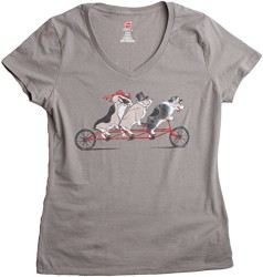 A ladies’ v-neck t-shirt with an artistic screen print of a group of fancy Welsh Corgis taking their tandem bicycle to tea time! Product Features 4.5 oz, soft 30