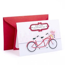 Send a love note to your significant other this Valentine’s Day with this card featuring an illustrated pink tandem bicycle with flowers and a bottle of wine in the
